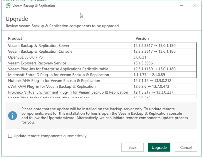 Review the list of Veeam components and plug ins that will be upgraded, then confirm before clicking Upgrade.