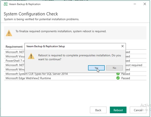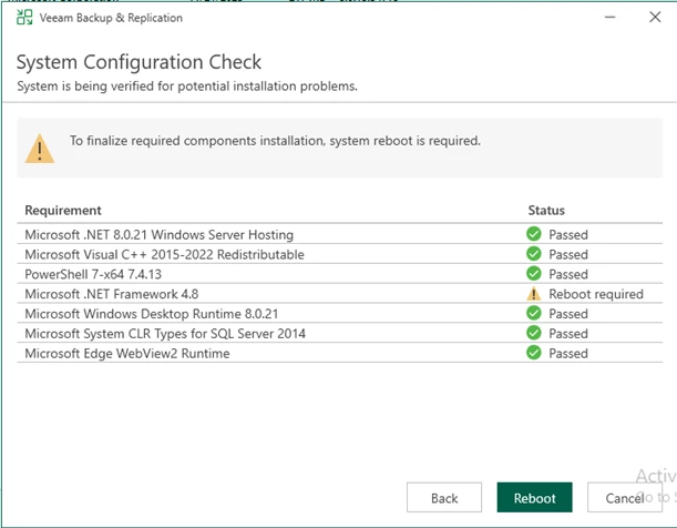 At the System Configuration Check step, the wizard verifies required software components. If anything is missing, the setup installs it automatically. After installation, a reboot may be required. Click Reboot, then restart the setup and continue.