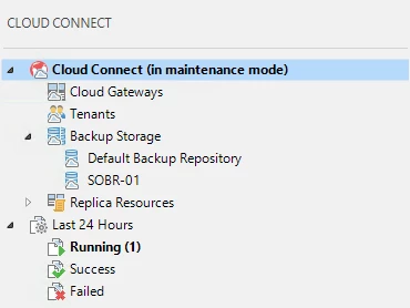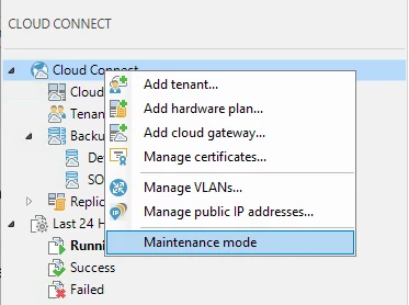To enable Maintenance Mode from the VBR console Right Click on the Cloud Connect top level tree item and click on Maintenance Mode