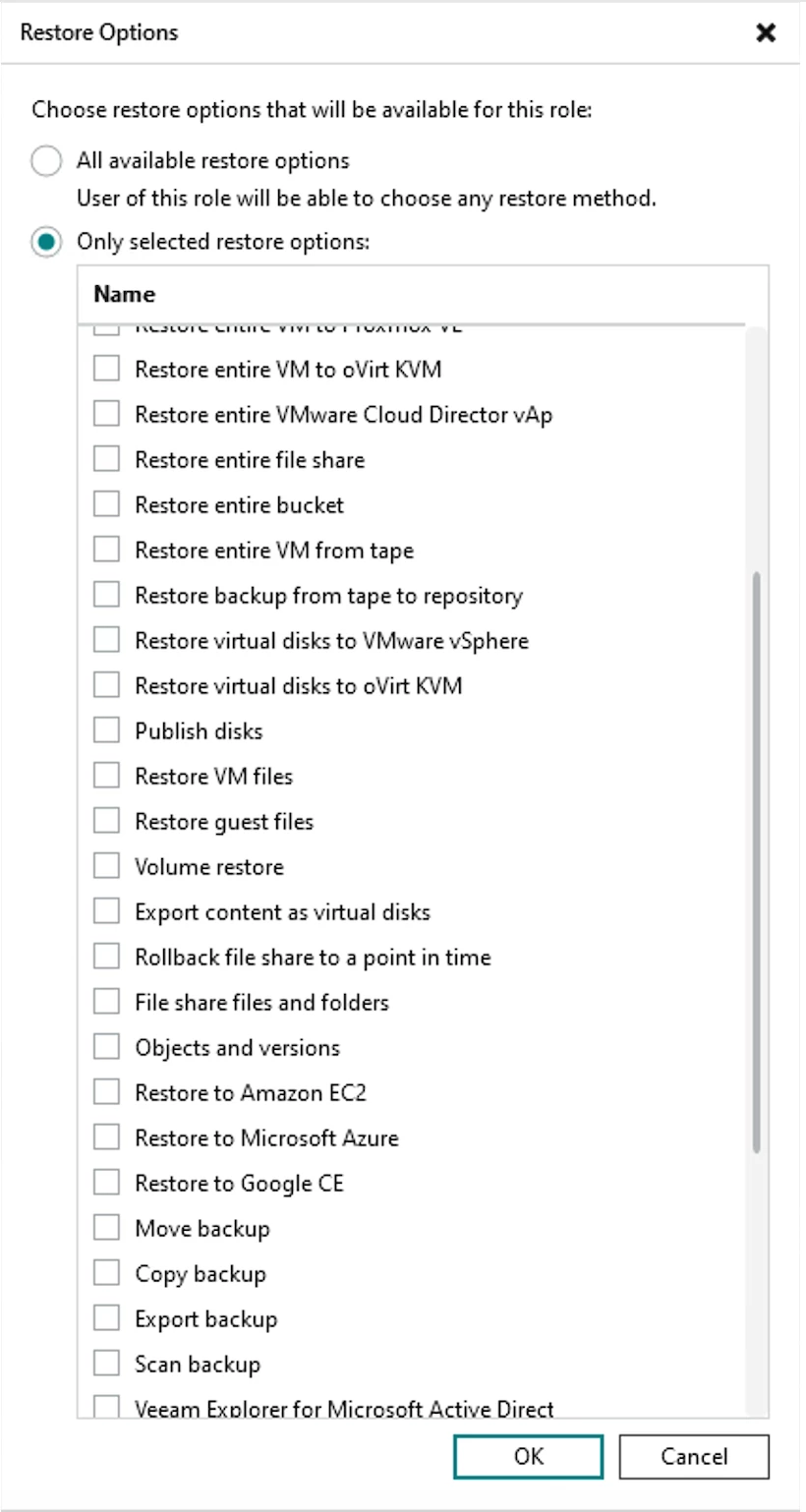 The high-level takeaway I'll share here though is you have quite the significant granularity you can assign users for what they can backup (from specific sources such as VMware VM Folders, Datastores, VM Tags, etc) and what Repositories they can backup to; as well as granularity of what specific recovery operations users are allowed to perform (e.g. Entire VM Restore, Instant Recovery, Disks, etc) and where users can perform restores to. Again, see my post above and the User Guide for detailed reference.