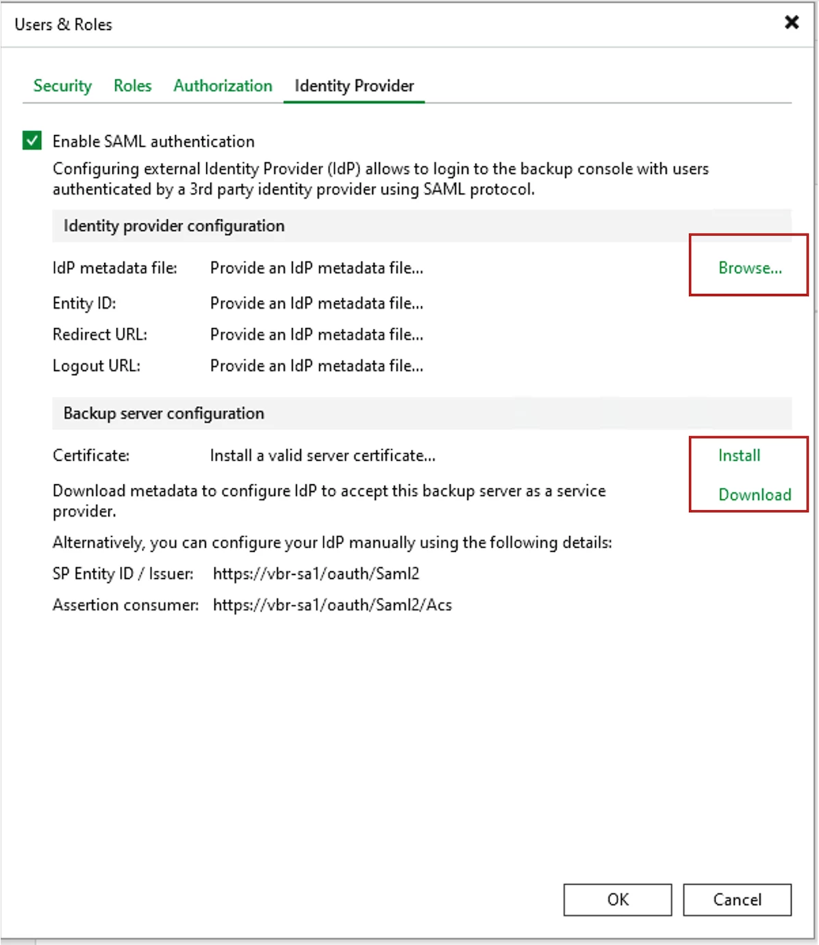 To configure SSO, from the Veeam Console (unable to add via WebUI currently), click the Menu icon > Users and Roles, then select the Identity Provider tab and configure the required settings. Follow the VDP User Guide for assistance for assistance if needed.