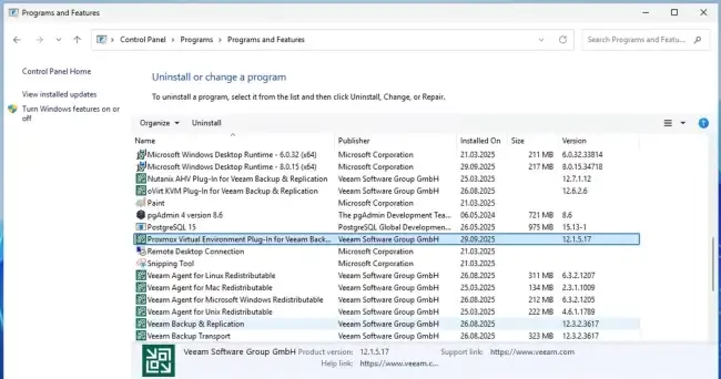 To see the current version of the Veeam Backup for Proxmox plugin that you are currently using. Please launch the Control Panel or Windows Settings as you wish. As you can see, we are currently using the version 12.1.3.217