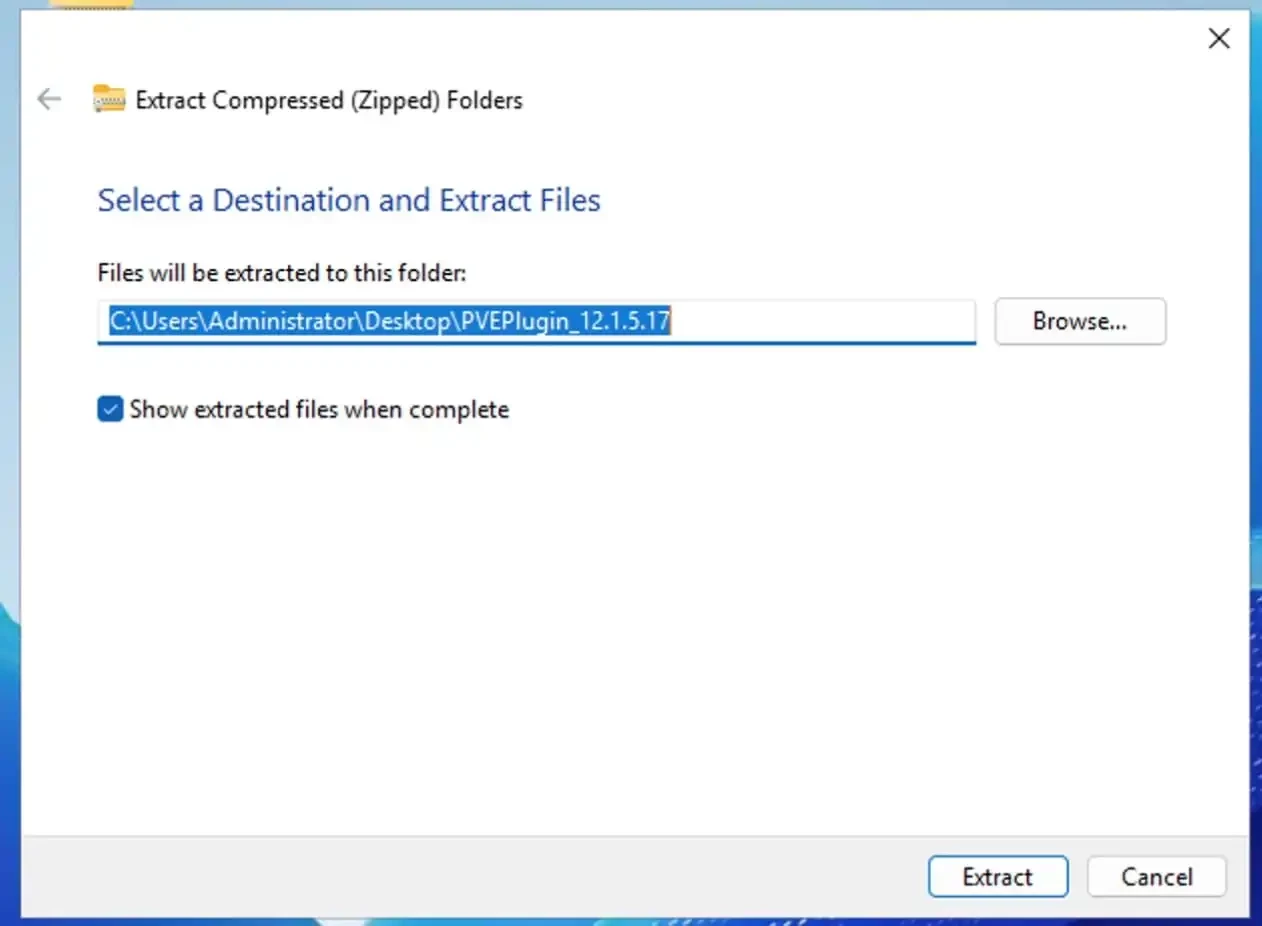 Next, we will have to copy PVEPlugin_12.1.5.17.zip to the Veeam Backup Server if you downloaded it externally. You can not unzip or extract as shown below.