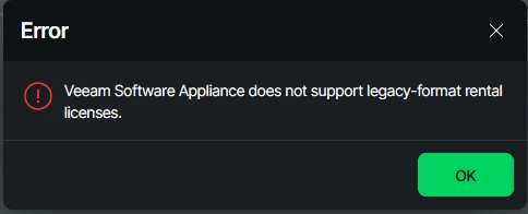 Veeam Software Appliance does not support legacy-format rental licenses.