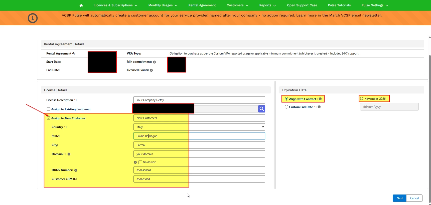 - If you need to create a new company or customer, proceed by ticking ‘Assign new Customer’.
