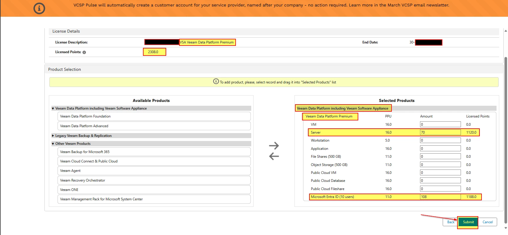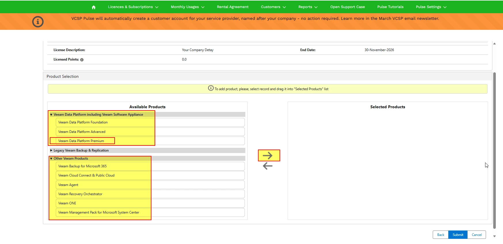 - Select the type of licence you need. In my case, I needed to issue a new Veeam Data Platform Premium licence for my new VSA.