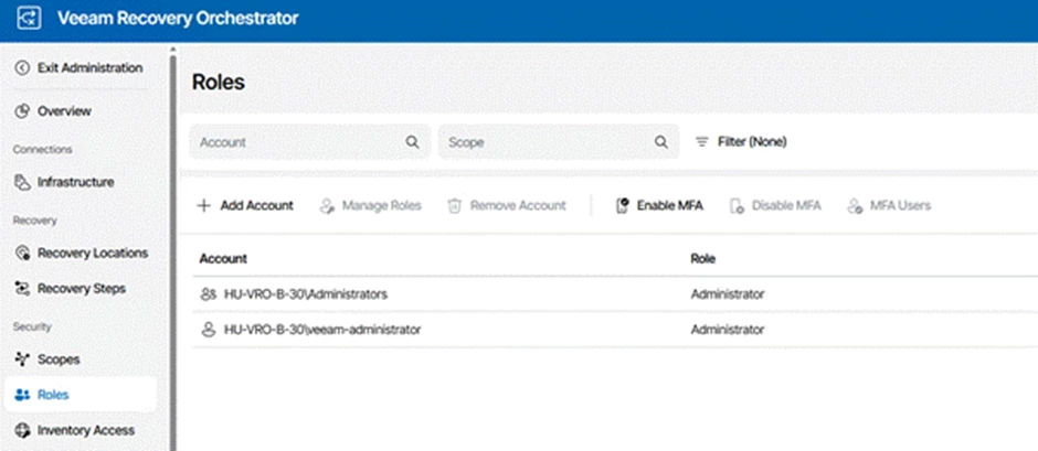 We then read the existing entries in the corresponding table VeeamAA.Account and added an explicit user, in this example with the user veeam-administrator.