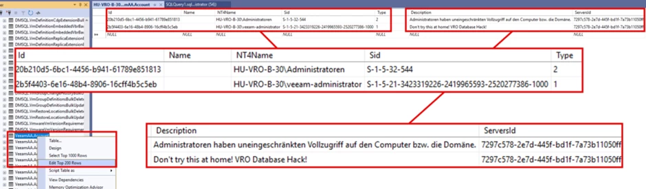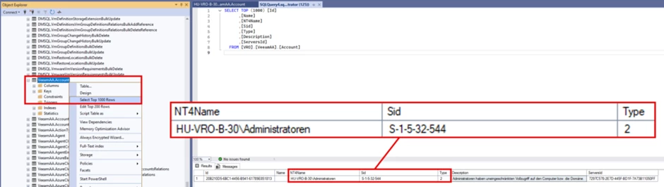 Back in the SQL Management Studio in the table VeeamAA.Account, the user veeam-administrator was stored in edit mode with his corresponding SID and the just created Guid. In the Type field, a 1 must be entered – as the type for a user (I was able to read this out at short notice in my lab), a 2 is for groups.