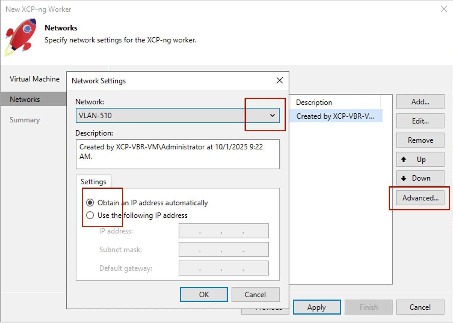 Take special note of the Advanced button. The settings here allow you to modify Worker VM vCPU and memory settings. Unless suggested by Support, I don't recommend changing these settings as Veeam determines what's optimal. When you've entered and chosen all required options on the 1st screen, click Next to configure the Network and, optionally, enter an IP address (if not using DHCP) the Worker VM will use to communicate with Veeam.
