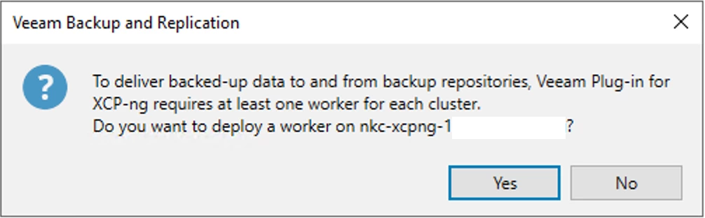 Click the Continue button. After you've completed the wizard, you'll receive a message whether you want to create a Worker VM or not. A worker VM here is analogous to using a VM as a VMware Proxy for hotadd. And this is similar behavior Veeam requires for other hypervisors they support, e.g. Proxmox.