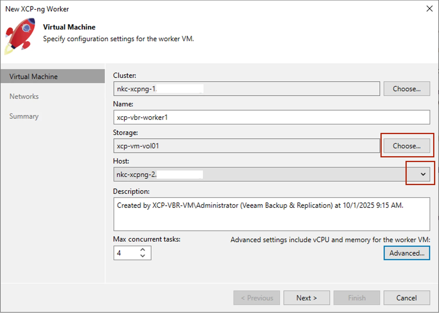 Configure and enter the requested info in the add Worker wizard. The Cluster will autopopulate with the "Cluster" (Pool Master) Host you just added, but you're able to click the Choose button if, for example, you're performing a manual Worker add. Click the Storage button to choose which storage location seen by the Cluster Host you'd like to place the Worker VM on; then click the drop-down to select the Host you want the Worker VM to reside on. Veeam recommends adding a Worker VM to each Host in a Pool, but in my testing, this was not needed..at least regarding Job performance. I do recommend doing so for redundancy purposes though. Interestingly, you can't control what Worker a Job uses (similar to the Proxmox Plugin), so I do have questions & curiosity how Plugin Backup Job logic works with regards to choosing Worker VMs for backups.