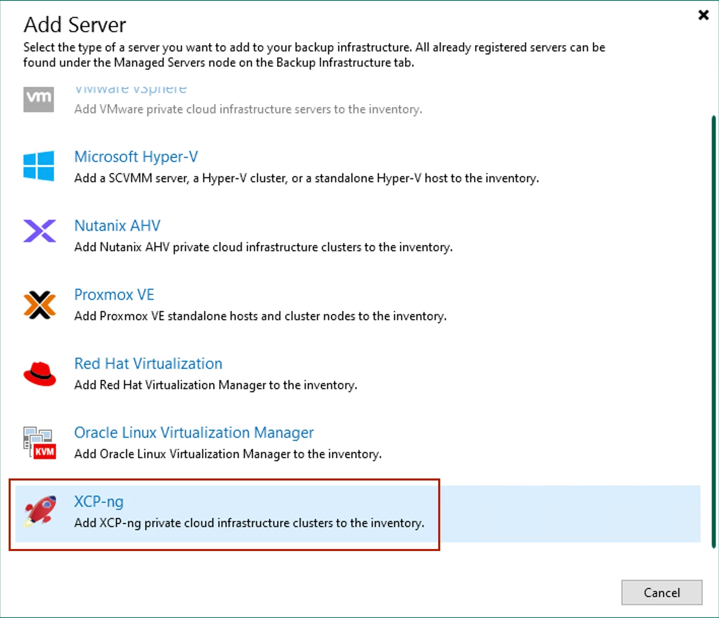 Now what's needed is to add your XCP-ng environment to Veeam. In the Veeam Console, go to the Backup Infrastructure node > Add Server. Select Virtualization Platforms, then choose the XCP-ng option: