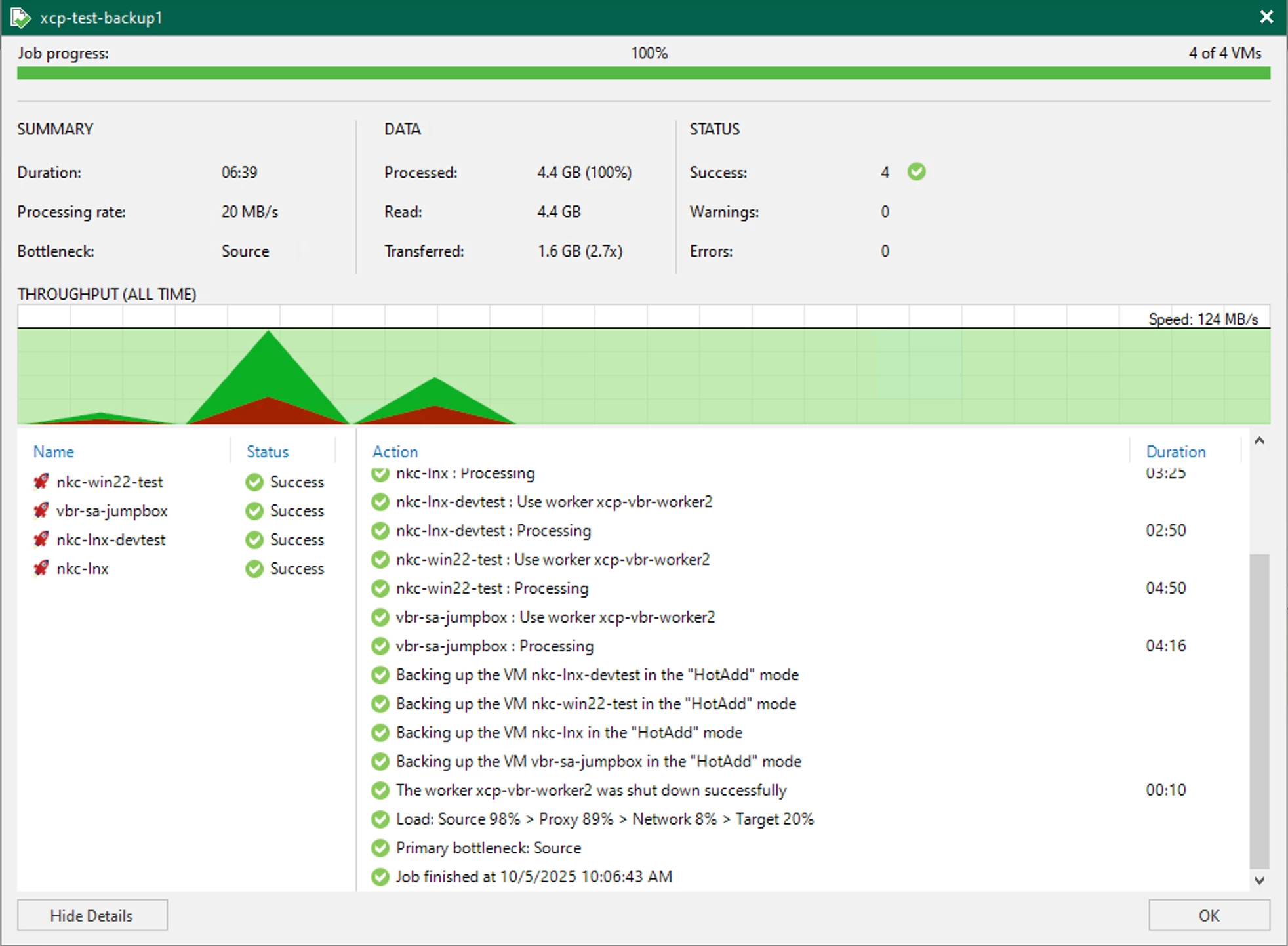 I know the Job throughput doesn't look that great but 1. these are small test VMs so, 2. the Job is completed in a matter of mins (6'ish, to be exact) so processing rate doesn't get too high. Initial run rate approached almost 500MB/s, so the Worker VMs do pretty well.