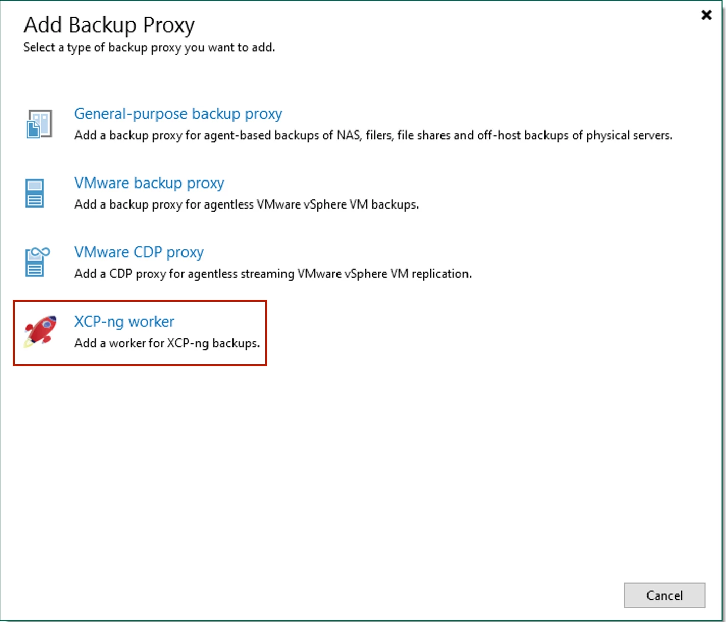 Though you don't need to add a Worker VM now, I recommend doing so... click Yes here. An add Worker VM wizard will display. NOTE: If you do select No, you can later add a Worker VM from the Backup Inventory node > Backup Proxies section by clicking Add Proxy and select XCP-ng worker as shown below: