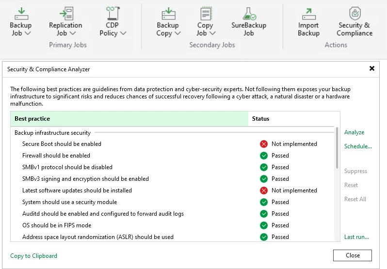 Veeam Backup & Replication provides a built-in tool to ensure that your backup server configuration follows security best practices for Veeam backup infrastructure components based on Microsoft Windows Server and Linux operating systems.