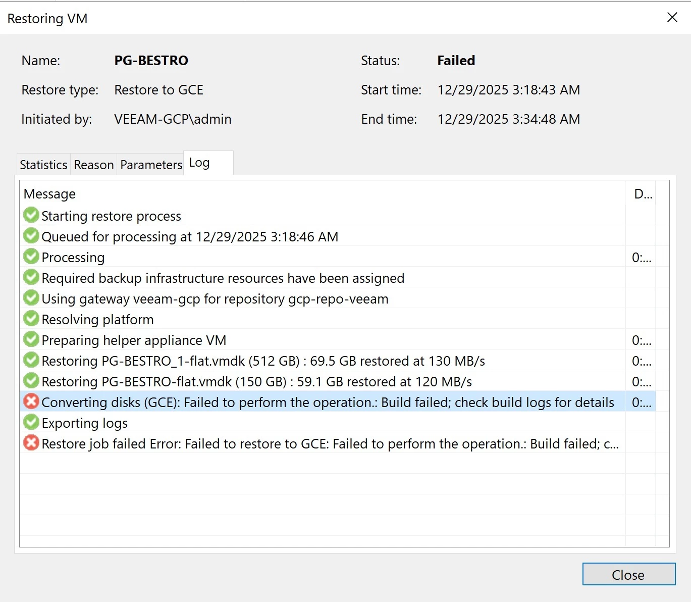 Failed import gce image import google cloud platform using VBR 12.3 and 13
