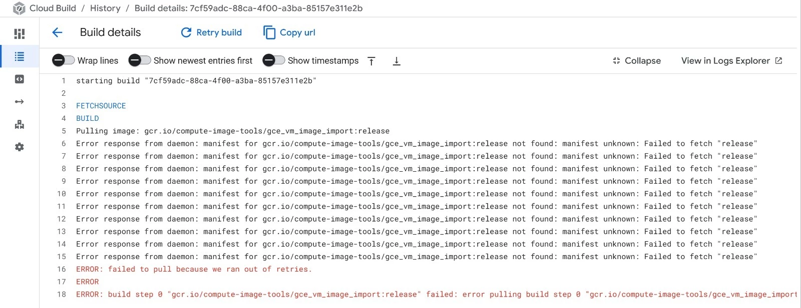 hi, im using VBR 12.3 deploy on GCE on GCP, I have succesfully backup and storing on GCS and i want to restore into GCE, and finnally failed, i consider VBR using Cloud Build to atomate restoring. the same log from VBR log and Cloud Build History. I think GCP not using GC, now using Artifact Registry, and i checked the image import link, its totally empty. any suggest in this case? the same case i using VBR 13.
