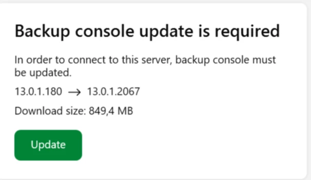 Updating the windows console to 13.0.1.2067 is systematically failing with the error “Failed to update the backup console: Failed to deliver update specification to backup server.”