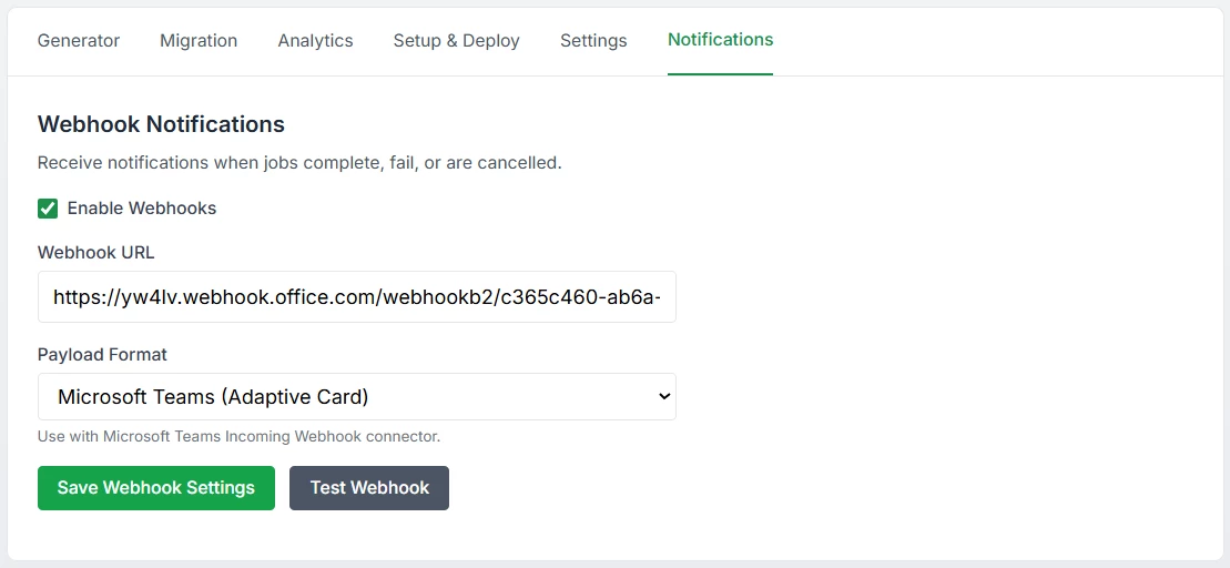 - Notifications: now that scheduled automation is running, it makes sense to keep you informed when a job completes, whether it’s a success or a failure. You can now set up webhook-based alerts. It supports multiple formats: Generic JSON, Teams and Slack are managed.