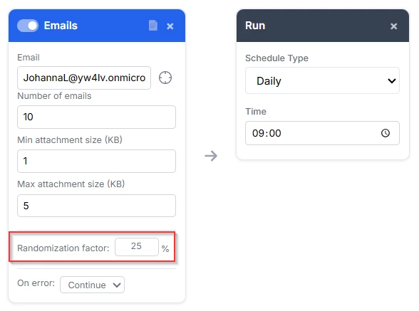 For example, if you schedule a job to generate 100 emails per day and set a random factor of 50%, the tool will create anywhere between 50 and 150 emails daily every day.