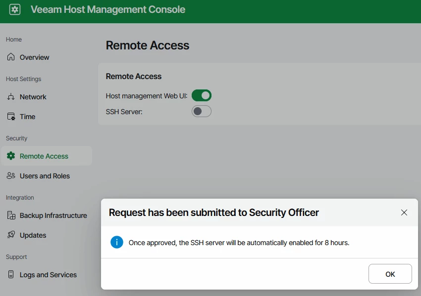 After enabling Remote Access in the Host Management Console of the VBR system - it’s mentioned, that this will be enabled after Security Officers approval and for 8 hours… We did this yesterday.