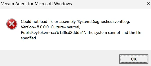 Could not load file or assembly 'System.Diagnostics.EventLog, Version=8.0.0.0, Culture=neutral, PublicKeyToken=cc7b13ffcd2ddd51'. The system cannot find the file specified.