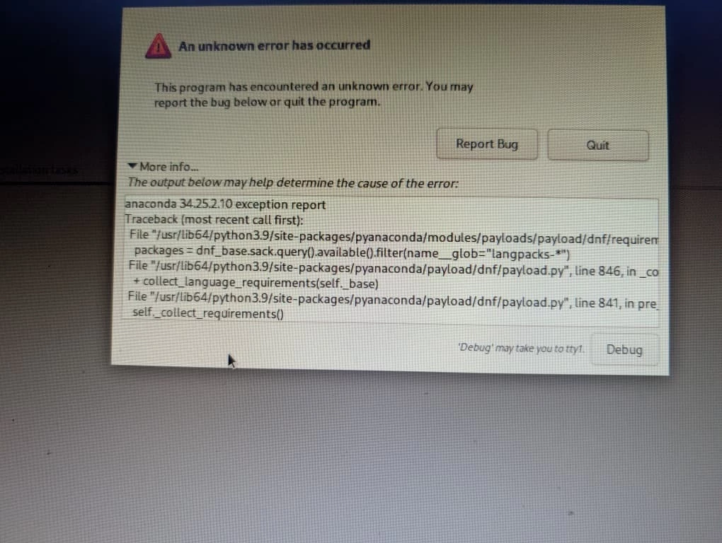 While installing Veeam Backup & Replication v13.0.0.4967 from the ISO (Rocky Linux–based appliance), the installer stops mid-way with an “An unknown error has occurred” message from Anaconda.