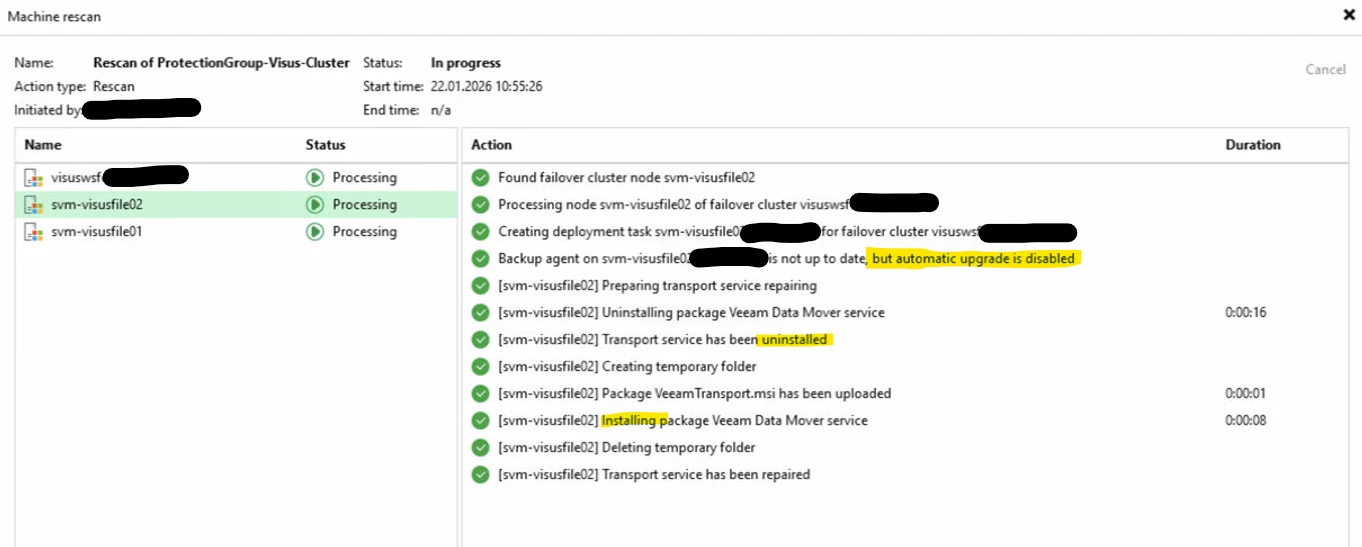 After the upgrade of the VBR to V13.0.1.1071 we did rescan the protection group to have it notice the now outdated agents.