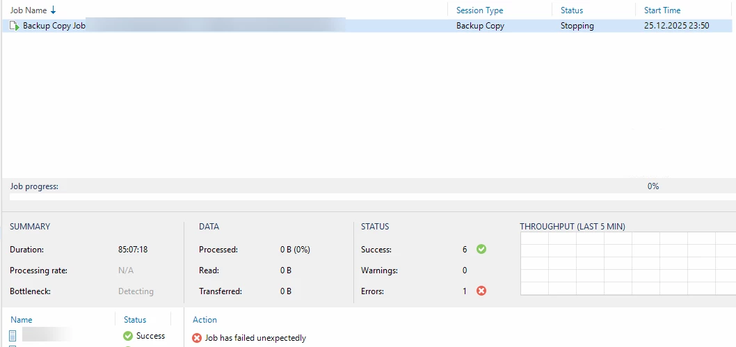 Problem: a copy job to a rotation drive (HDD) is running since 3 days. I stopped job and confirmed with yes, but since hours status in dashboard running jobs is “stopping”. I can disable job but not delete.