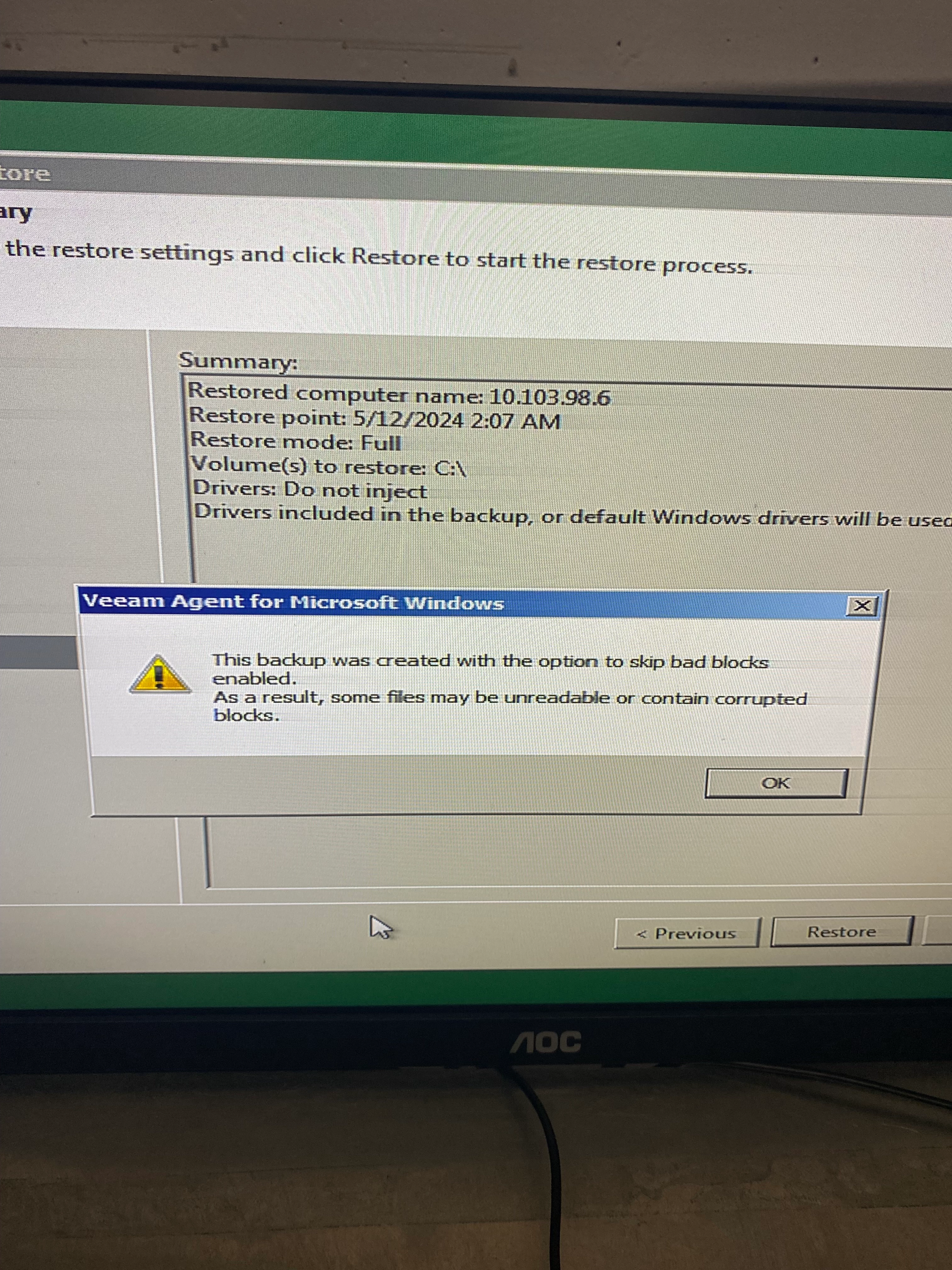 ** Noticed a warning as shown on the image during restore process . does it related to this booting issue ?