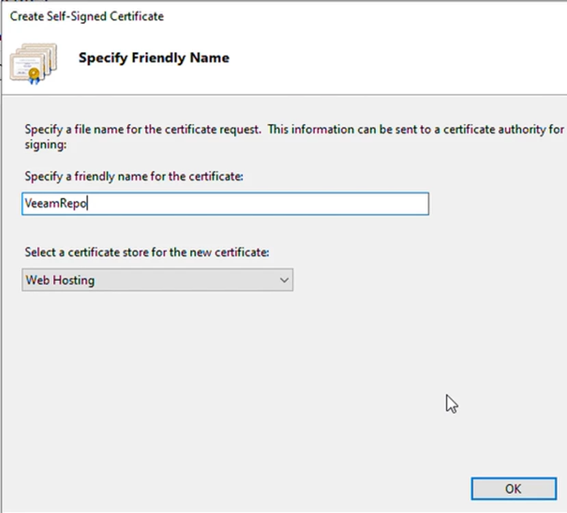 -> Fill in the URL / hostname of where you are planning to host your web server. In my case, I will ensure that “VeeamRepo” resolves to the correct IP address using the host file.