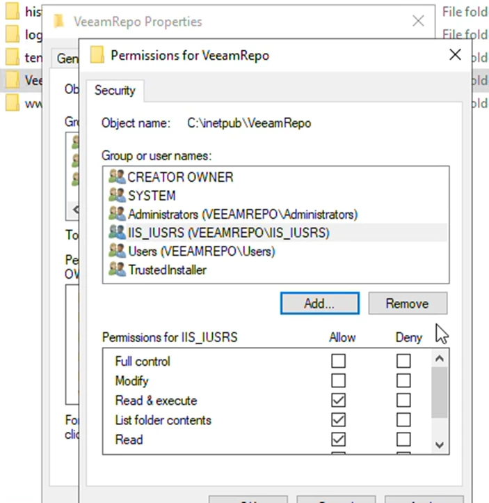-> Now change the permissions setting of VeeamRopo folder to match wwwroot folder. In my demo lab, I should just add the IIS_IUSER with ‘Read & execute’, ‘List folder contents’ and ‘Read’ permission.