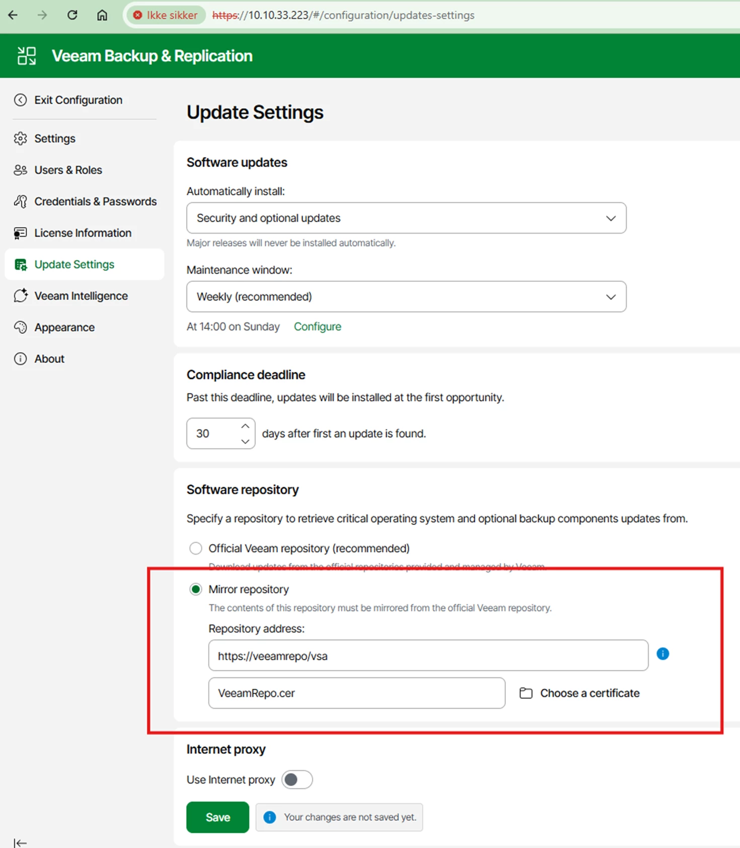 Now we can go to the Veeam Software Appliance or Veeam Infrastructure Appliance “Custom Update Configuration”: https://helpcenter.veeam.com/docs/vbr/userguide/update_appliance_configure_updates.html?ver=13#setting-up-custom-update-configuration