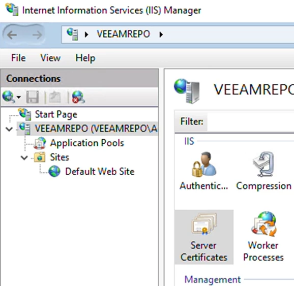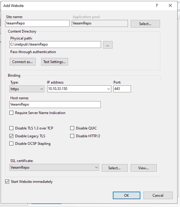 ->Add a new website by selecting c:\inetpub\VeeamRepo as the root folder, binding with https and the url/hostname also used in the certificate. I my case I want to make sure to bind the website to the fixed IP of the server, this way I make sure that I can control access by local firewall or by the network firewall if you have one. Remember to select the new Self-signed certificate.