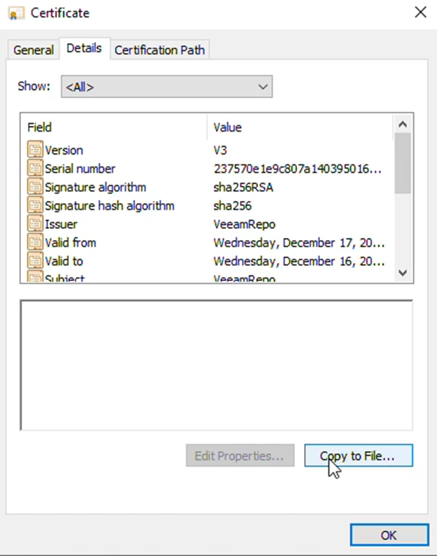 If asked about the certificate format, you can use the Base-64 encoded X.509 (.CER) format, which works for me. I exported to a VeeamRepo.cer file.