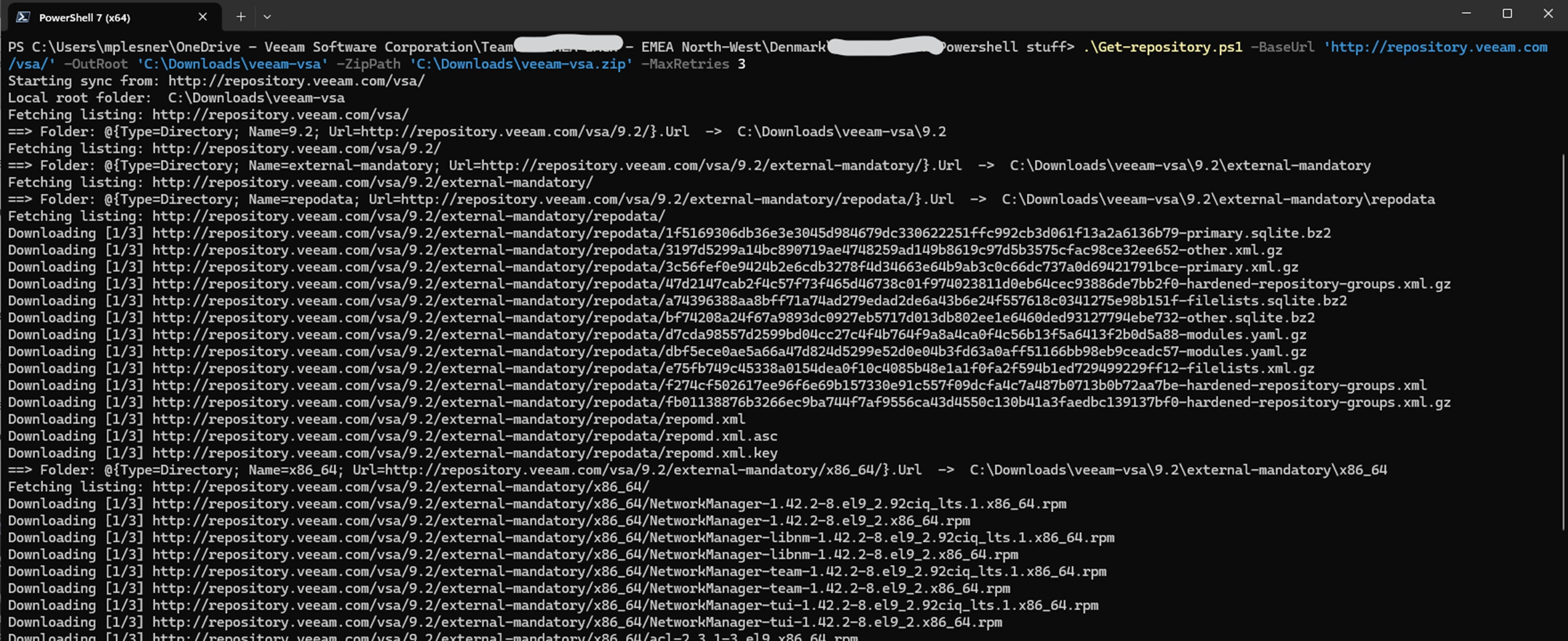 So, for the first step, we need a PowerShell script that can download all files from https://repository.veeam.com/vsa (BaseUrl) to a local folder (RootOut) and then kindly ask the user if we should create a zip files (ZipPath) and if your internet is unstable you can set the retry (MaxRetries) to 3