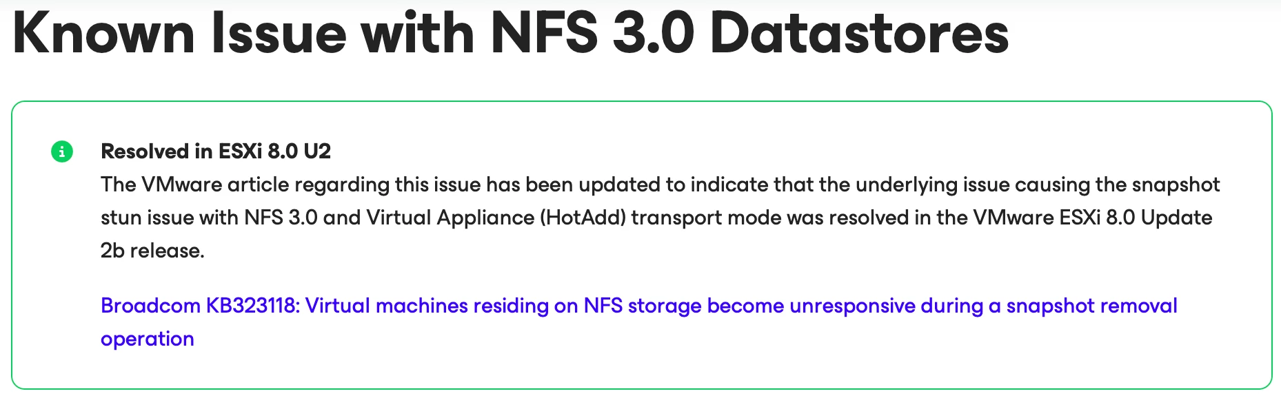 According to the KB, the stun issue was supposedly fixed in vSphere 8U2b release for NFS3.0. So, if you’re not on VMW8U2b...then you’d still have the issue: