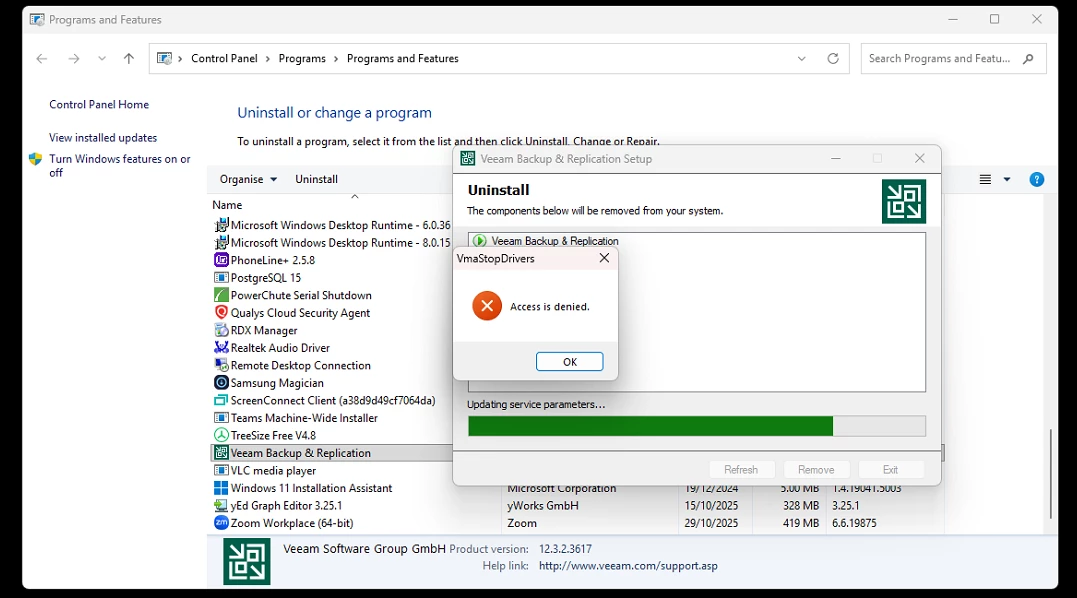We are getting a VMAStopDrivers error message when trying to uninstall the Veeam Backup & Replication software. We are running from Programs & Features on an account with full admin access to the computer, on Windows 11 Pro v25H2.