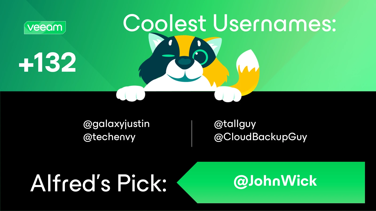 Thank you @safiya for prepping the Who’s New this week. We are happy to welcome +132 new members into the community, with @galaxyjustin, @techenvy, @tallguy and @CloudBackupGuy having the coolest usernames. Alfred’s pick is @JohnWick -? You have a badge coming your way. Have a great weekend everyone!