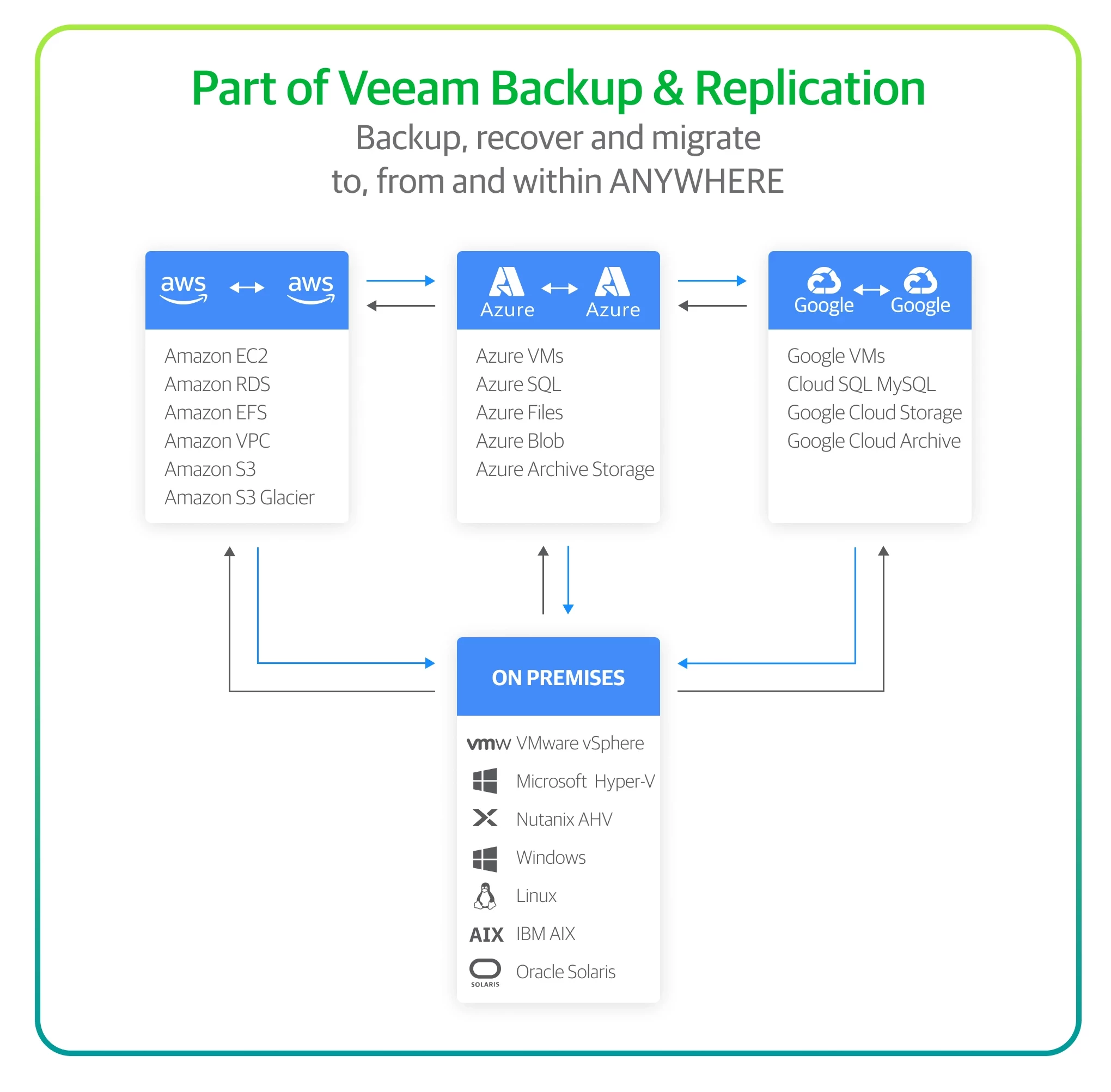 With Veeam Backup & Replication via Microsoft Azure Plug-in for centralized and unified management and monitoring of hybrid-/multi-cloud environments, which provides you with a greater portability of backups and opportunity to store data on premises as well as across any of the supported public cloud providers.