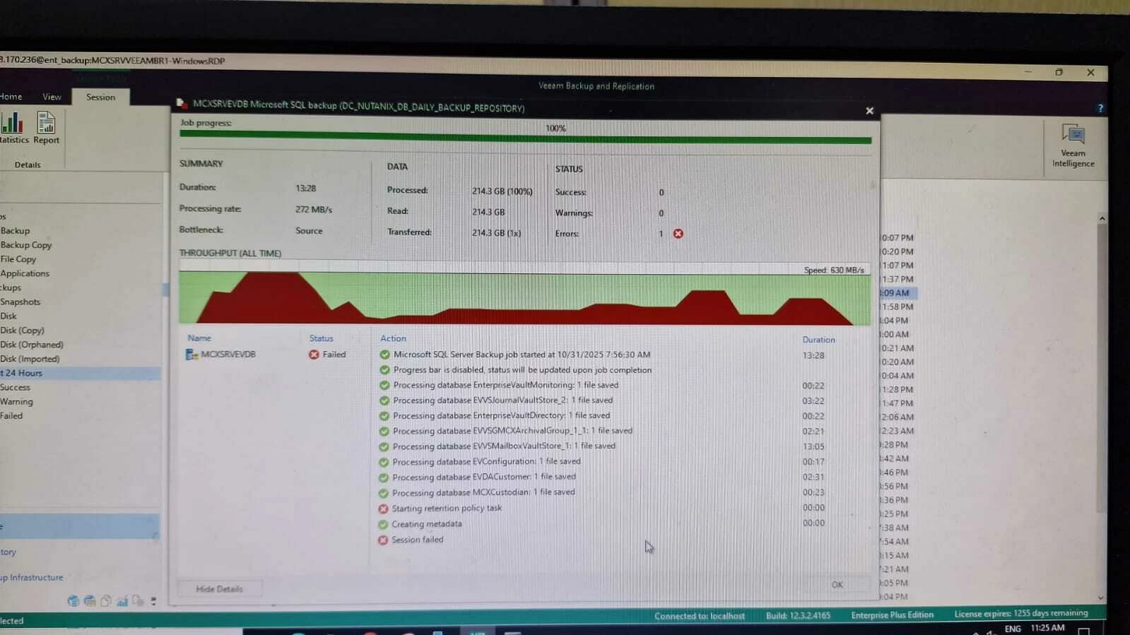 One of our customers is facing an issue with the MSSQL plugin backup failing. Upon verification, I noticed that the backup data is being written successfully, but the job fails with the error “Starting Retention Policy Task.”