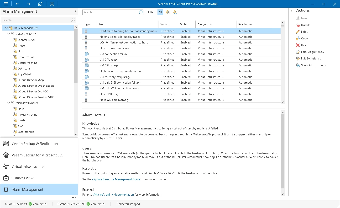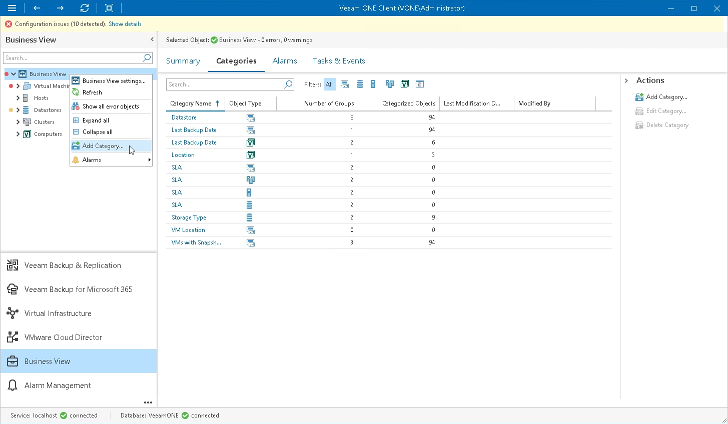 Monitora costantemente l'ambiente e organizza i dati raccolti in dashboard, widget, report per le decisioni aziendali e per il rispetto delle policy di governance e compliance. Attualmente supporta il monitoraggio di tecnologie quali vSphere, Hyper-V, VMware Cloud Director e workload SaaS, oltre chiaramente agli ambienti Veeam B&R.