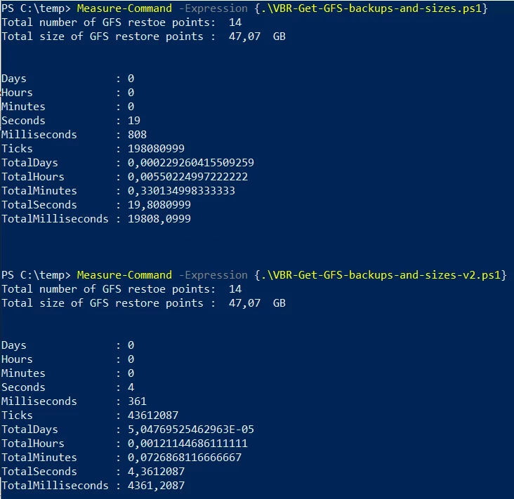 # Communicate results Write-Host "Total number of GFS restoe points: " $gfsRestorePoints.Count Write-Host "Total size of GFS restore points : " $totalSize " GB"