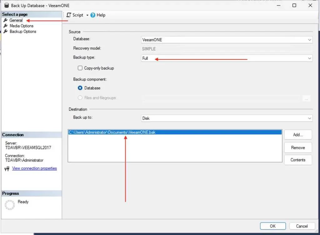 Set Backup Type to Full. Specify the database file destination by choosing the Back up to Disk option > Add the destination path to save the database backup.