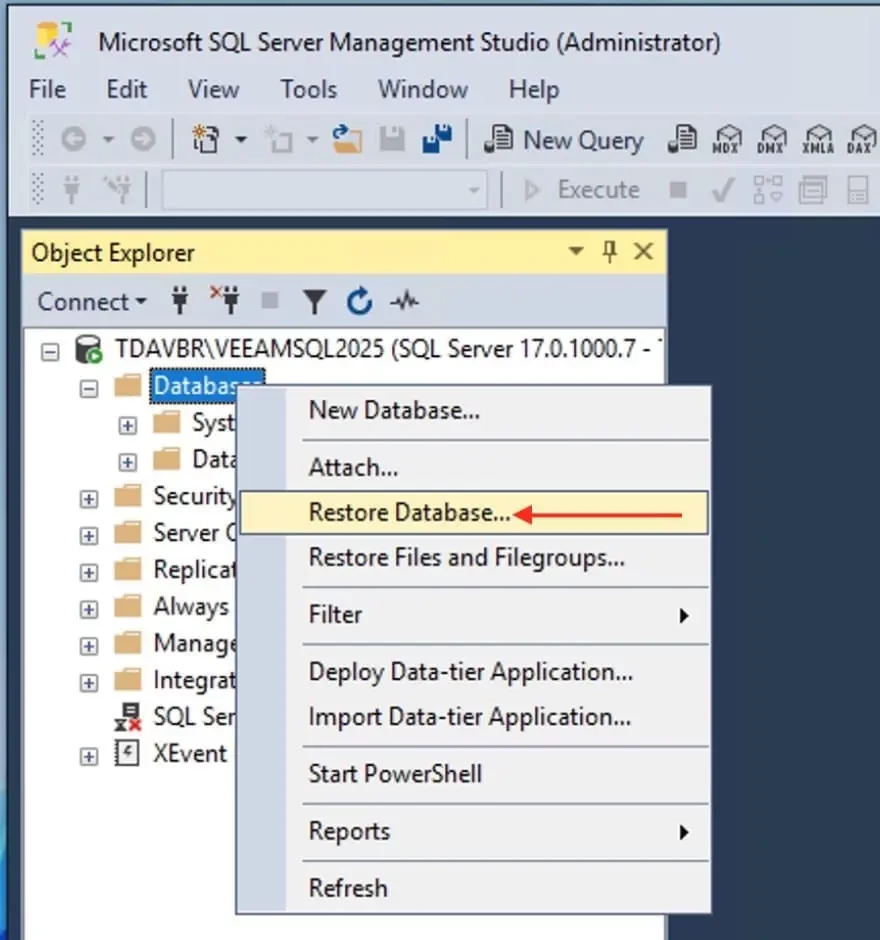 On the SQL 2025 server, open SSMS and connect to the new instance. Right click on database and select restore