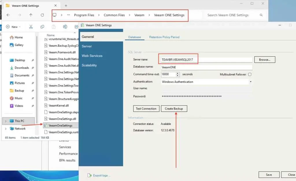 Veeam recommends that if the Veeam ONE database is located in a SQL Instance on the same server as the Veeam ONE software, use the Create Backup button within the Veeam ONE Settings Utility.