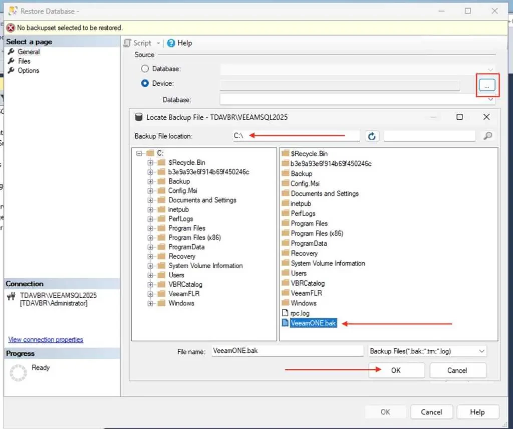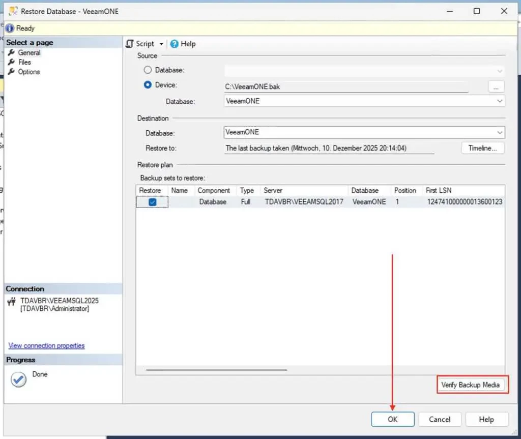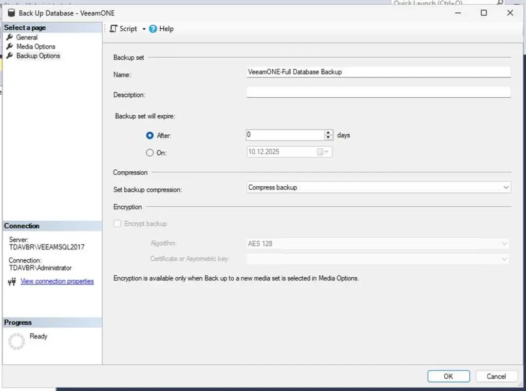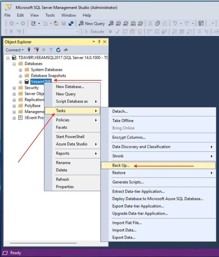 If the Veeam ONE database is located in a SQL Instance on a remote SQL Server, a backup must be created using either SQL Server Management Studio or SQLCMD on that remote SQL Server.