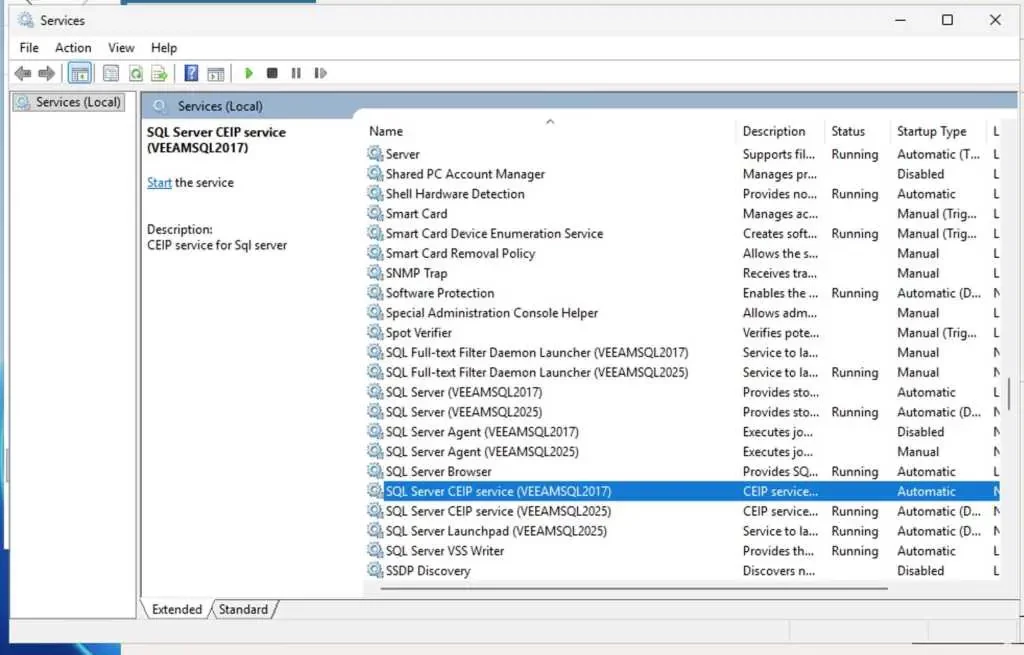 Log in to Veeam ONE and verify that that the application starts without errors. As you can see below, all services relating to SQL Server 2017 have been stopped.
