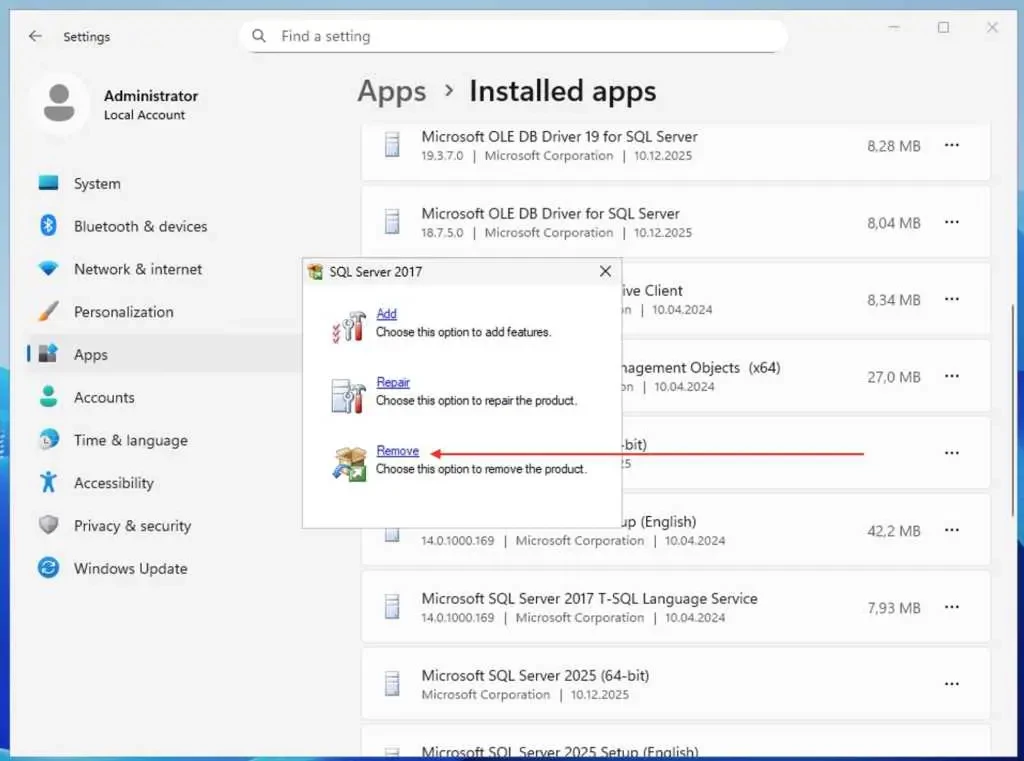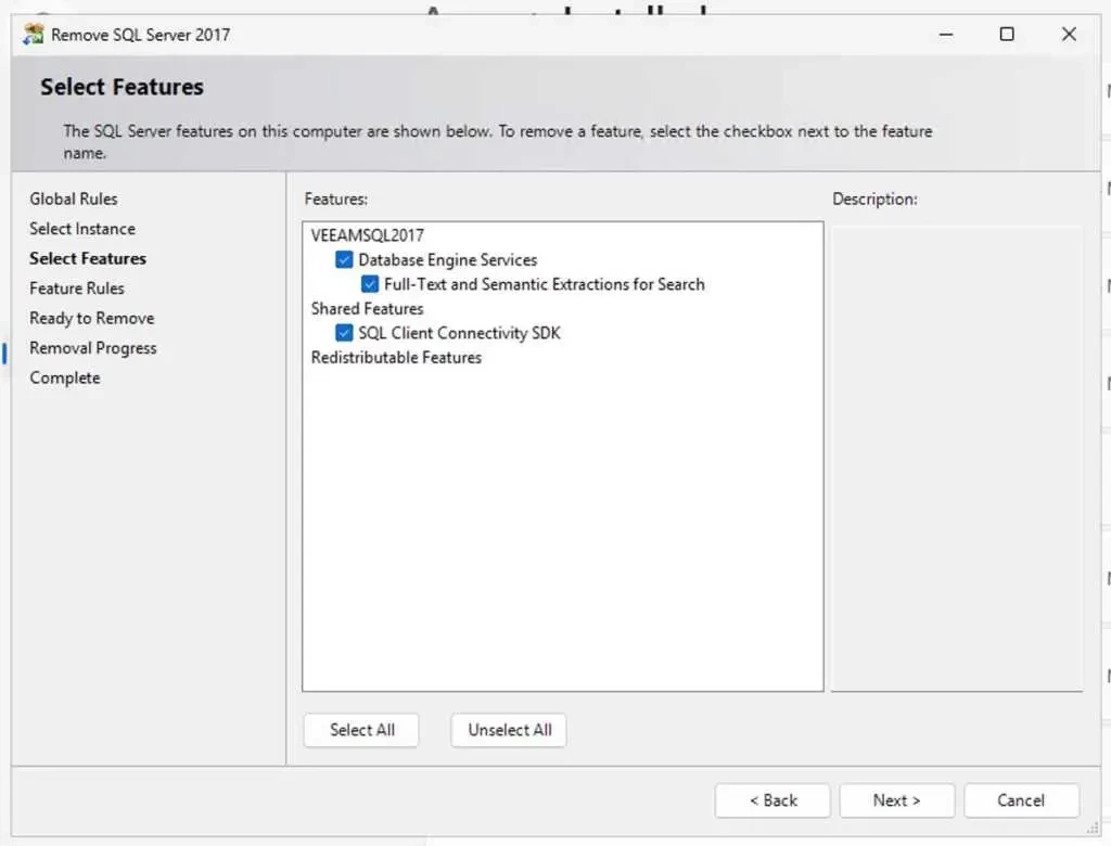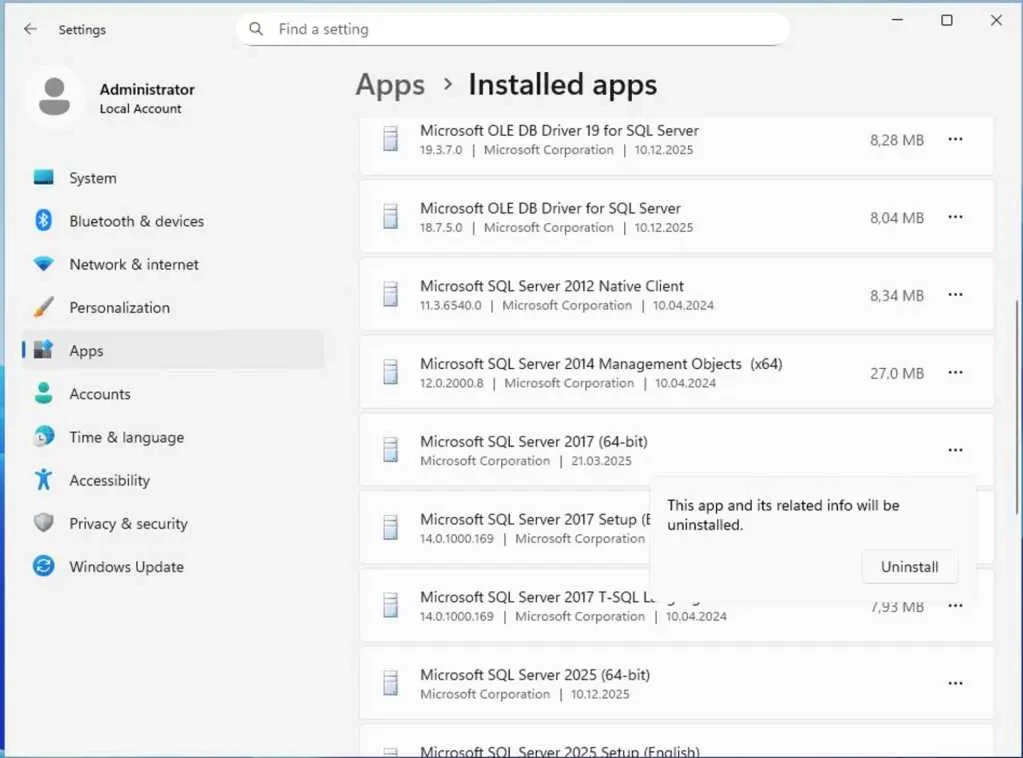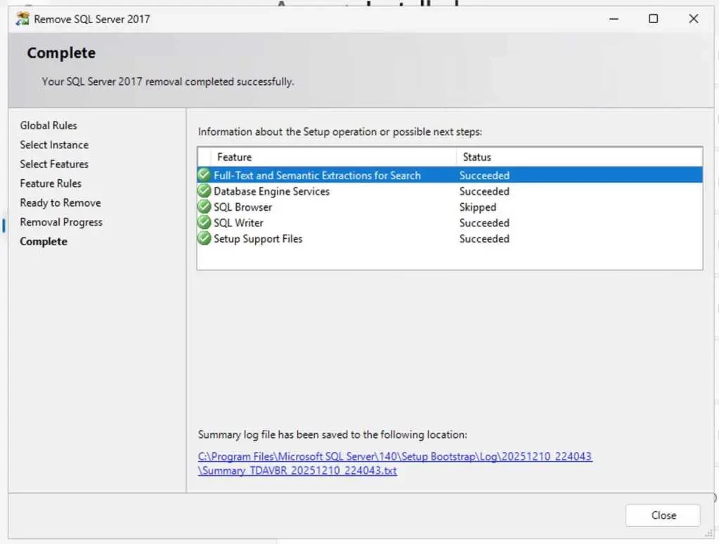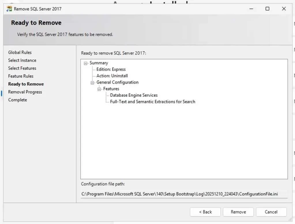 Since this is my lab environment, and I have confidently testing that the migration succeeded successfully. I will proceed and uninstall SQL Server 2017 (64 bit) from this machine.