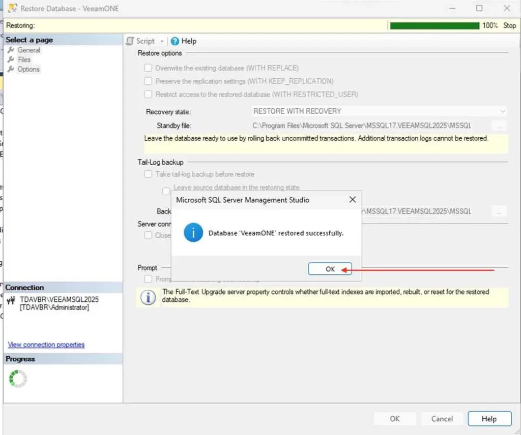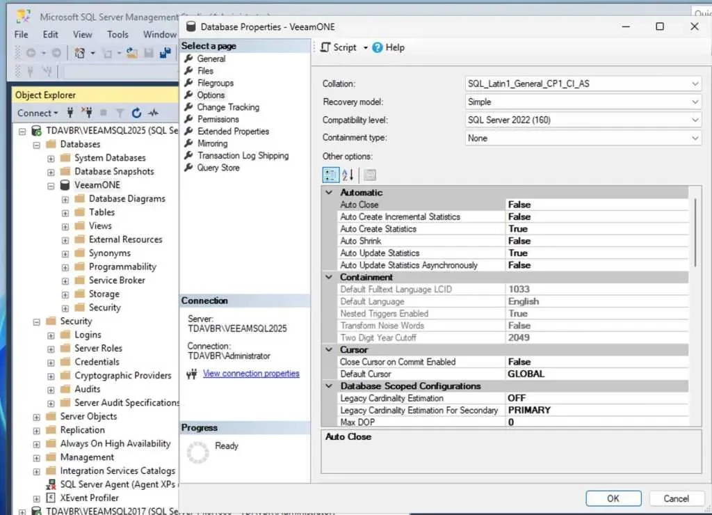 After restore, you can optionally set the database compatibility level 160 etc. This can be done in SSMS under Database Properties and click on Options. Veeam recommends a level at least 130